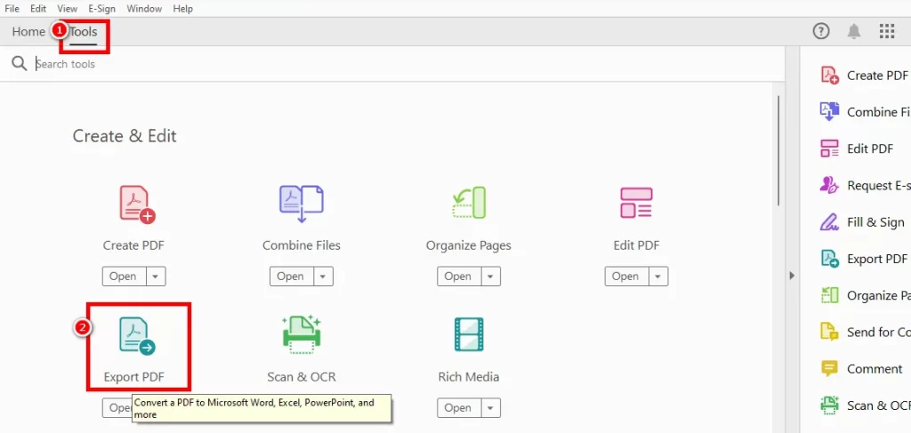 Step 1. Launch the Adobe Acrobat DC > Open your PDF > Find the Export PDF tool > Hit it to open the tool window.